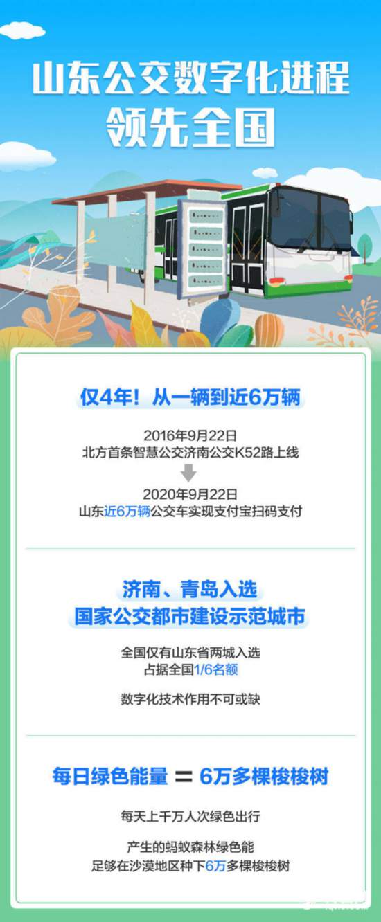 9月22日是世界無車日。四年前的今天,濟南公交K52路作為北方首條智慧公交線路上線支付寶,開啟山東公共出行數字化的序幕。4年的時間,從一輛公交車到近6萬輛公交車,每天有上千萬人次在山東16地市享受著數字化出行的便利。山東公交數字化進程,以其普及深度、受益廣度、便利程度,領先全國。
