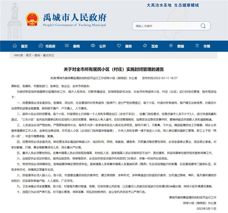 人民網德州3月11日電(公雪)11日,德州禹城市發布關於對全市所有居民小區(村庄)實施封閉管理的通告。