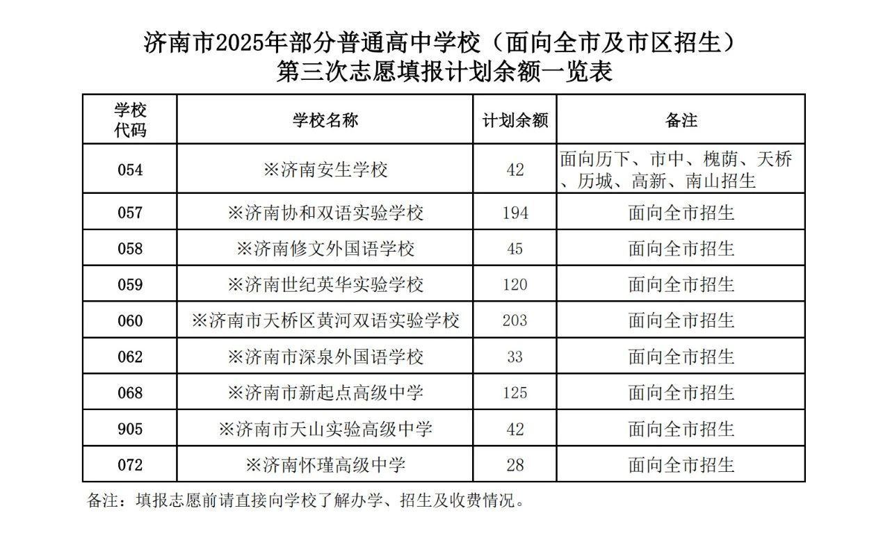 濟南市高中階段學校招錄第三批次志願填報說明及剩余招生計劃(不含萊蕪、鋼城)