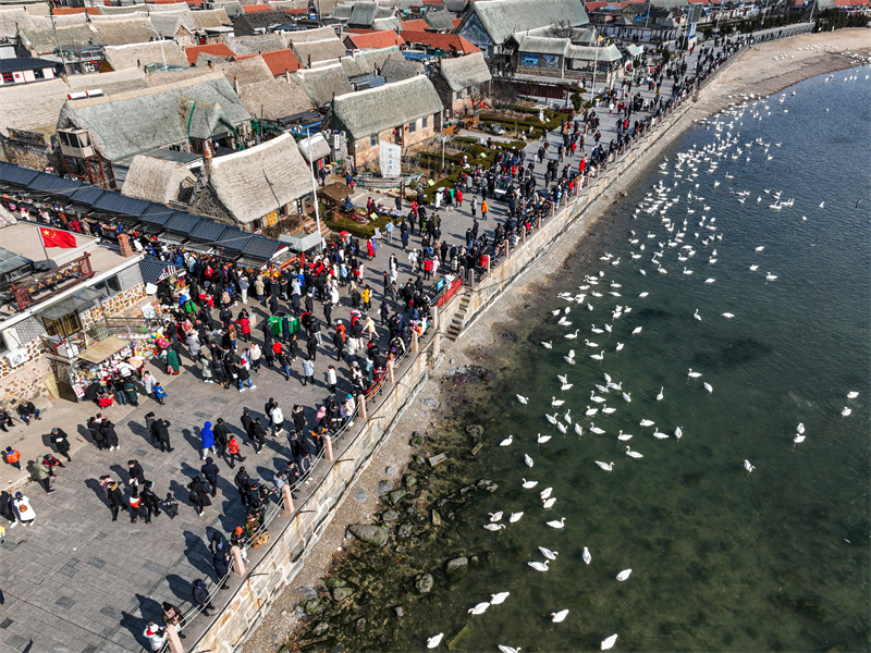 如今,“看天鵝,到榮成”已經成為冬季旅游的熱門選擇。每年冬季,數以十萬計的游客和攝影愛好者慕名而來,帶火了當地的“天鵝經濟”。民宿一房難求,餐飲、零售等行業持續升溫。俚島鎮煙墩角村更是乘勢而起,發展出“夏游牧場、冬賞天鵝、住海草房、吃漁家飯”的生態旅游產業體系,2024年,入選聯合國旅游組織2024年最佳旅游鄉村。