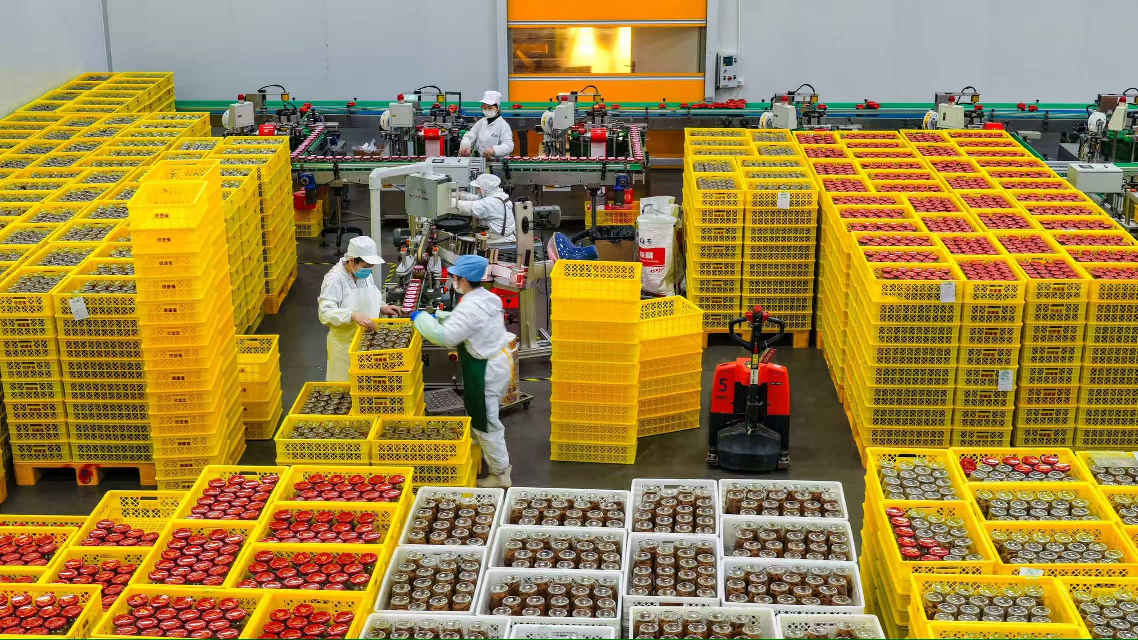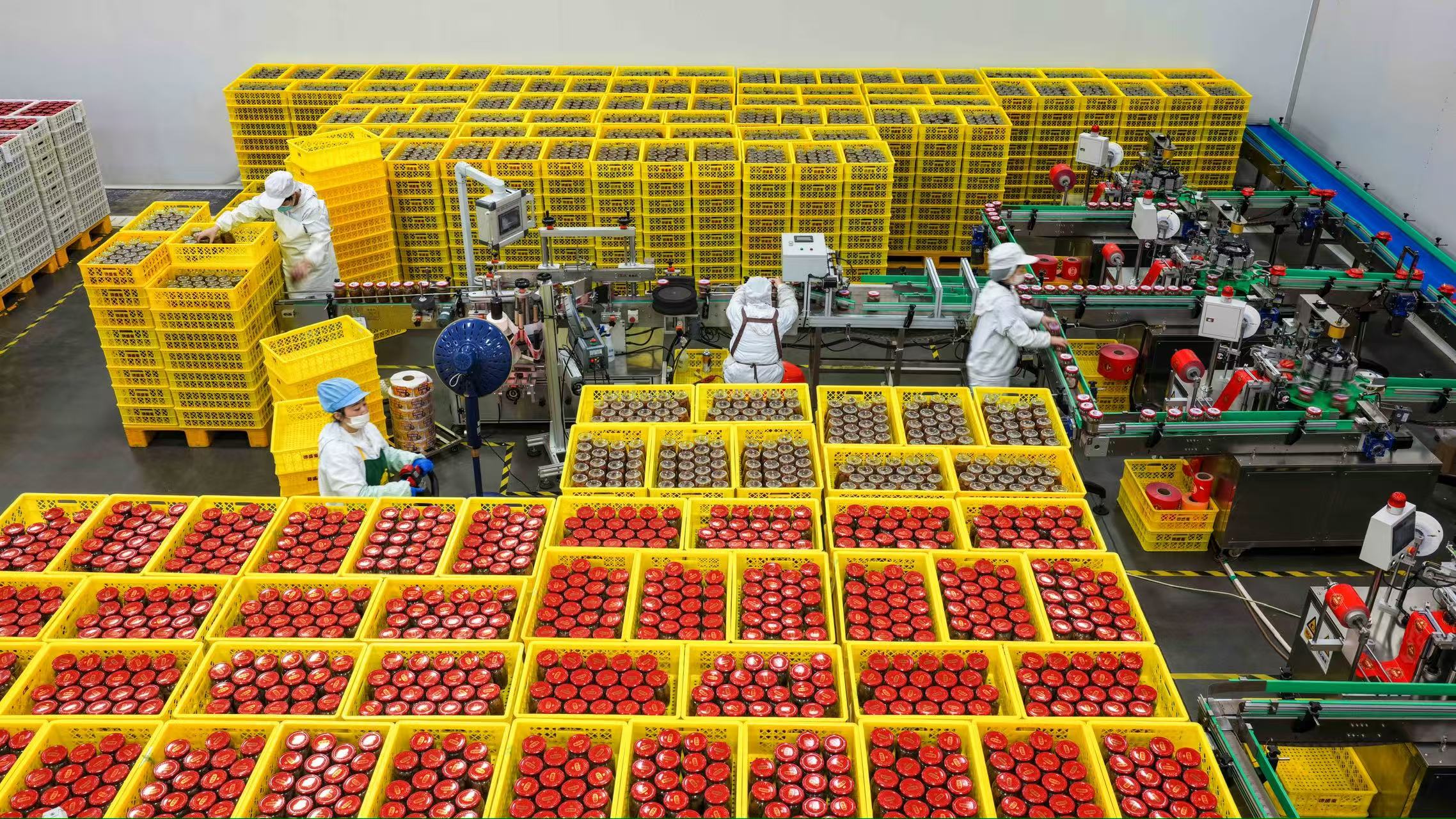 2026年2月3日,山東金鵬德盛齋扒雞有限公司魚罐頭生產車間,員工正在趕制訂單產品(無人機照片)。