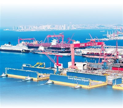 青島海西灣船舶與海洋工程產業基地,中船北海造船在建造大型船舶。 |