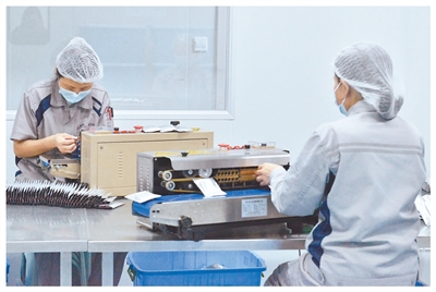 逢時科技透明工廠內,工人為外包裝貼標。 |