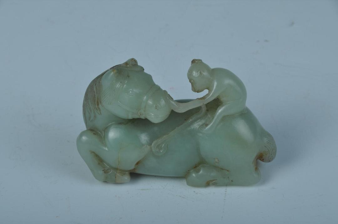 這件文物以青玉為料,長8厘米、寬3.3厘米、高5.5厘米。運用圓雕技法,雕出臥馬回首的姿態,馬背之上,一隻靈猴佇立。駿馬膘壯健美,鬃毛披散頸間,馬首絡頭紋飾細膩。靈猴身形小巧,左臂輕撫馬嘴,右手摩挲頭頂,面部褶皺清晰可辨。玉質純淨無瑕,刀工精雕細琢,無一絲冗余。