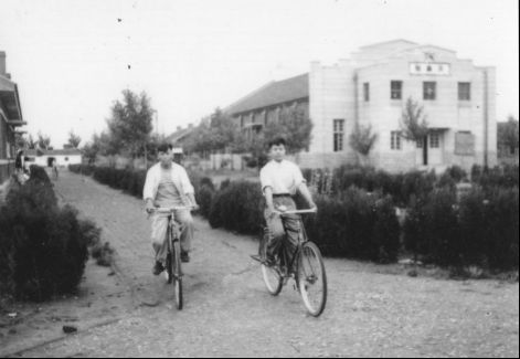 李庆洪手中,保存着一张齐乃义老先生当年在干训班的老照片。照片上两位青年骑着自行车,腰背挺直,姿态潇洒,意气风发,背景是一座气势恢宏的礼堂。“这张照片摄于干训班校园,右边这位就是齐乃义,他是随干训班从济南来到淄博的,后来干训班迁回济南,他则经组织上研究,留在了淄博参与筹建南定玻璃厂。干训班在淄博四年半时间,培训了300多名工业干部,均成为山东工业恢复生产和支援全国的骨干力量和火种。”