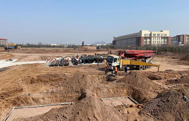 在青岛智造港项目施工现场,4台挖掘机进行基础开挖,几十名工人戴着口罩和头盔,在工地上进行支设模板、浇筑混凝土基础垫层施工和临建道路施工,一派繁忙景象。
