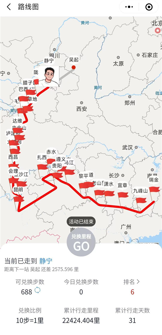 烟威分公司机关党支部利用微信小程序,依托“微信运动”计步功能,以“步数换里程”的方式模拟行走二万五千里长征路,线上“长征路”共设置26个站点,按照长征路线顺序,从江西瑞金出发,途经宜章、遵义、赤水、泸定桥等地,最后到甘肃吴起会师。参赛者每到达一个点,便可解锁该地的党史知识,学习长征精神,铭记先烈遗志,提振干事创业精气神。活动采用线上比拼的方式,督促员工利用上下班途中、工作中、生活中走路来获取步数,真实模拟红军二万五千里长征的光辉历程,将党史学习、强健体魄融为一体。
