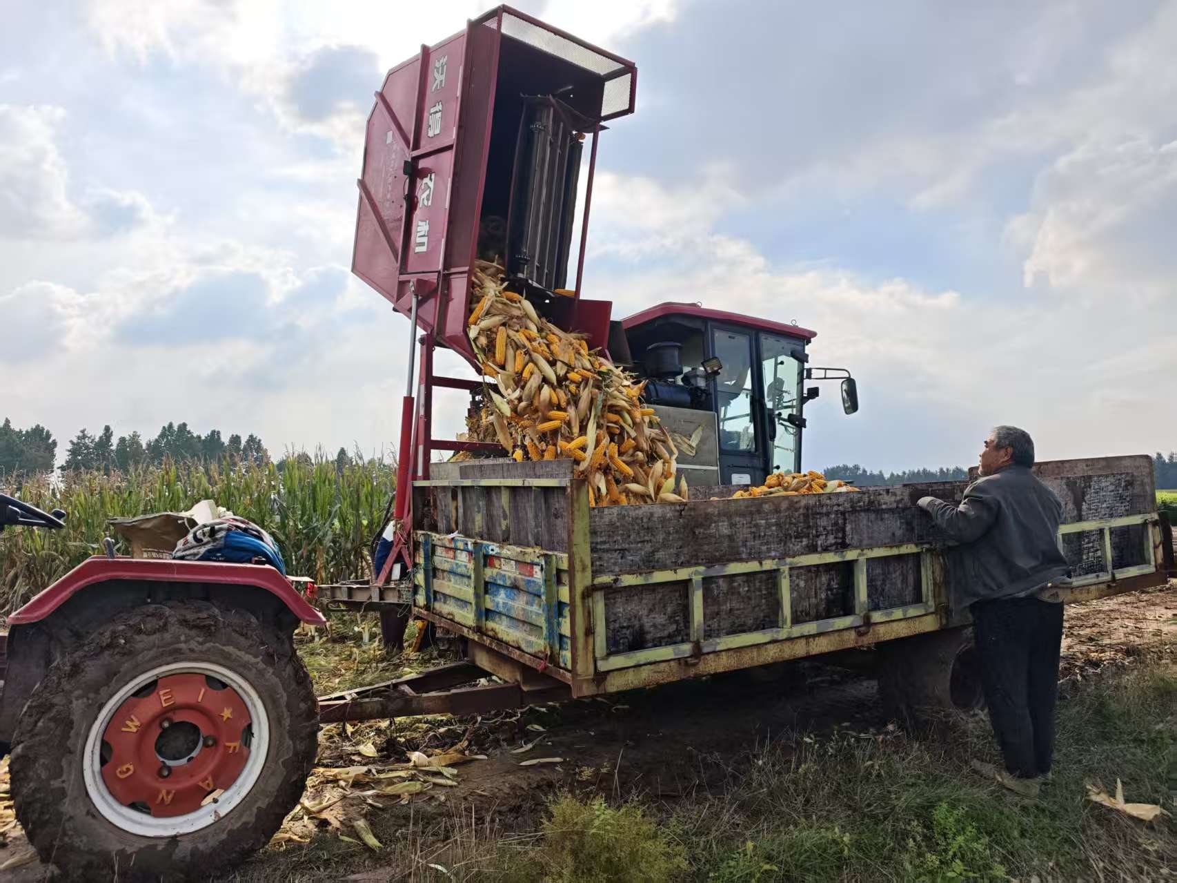 这种被村民称为“防滑坦克”的农机,凭借加宽履带增大接地面积,在泥泞地块如履平地,一小时可收获数亩玉米,有效解决了“湿田难收”的问题。“以前靠人工抢收,一天顶多收一亩,现在机器一响,几亩地的玉米很快就收完了,社区真是帮了大忙!”看着金灿灿的玉米源源不断倒入车斗,村民们的愁容换成了笑容。