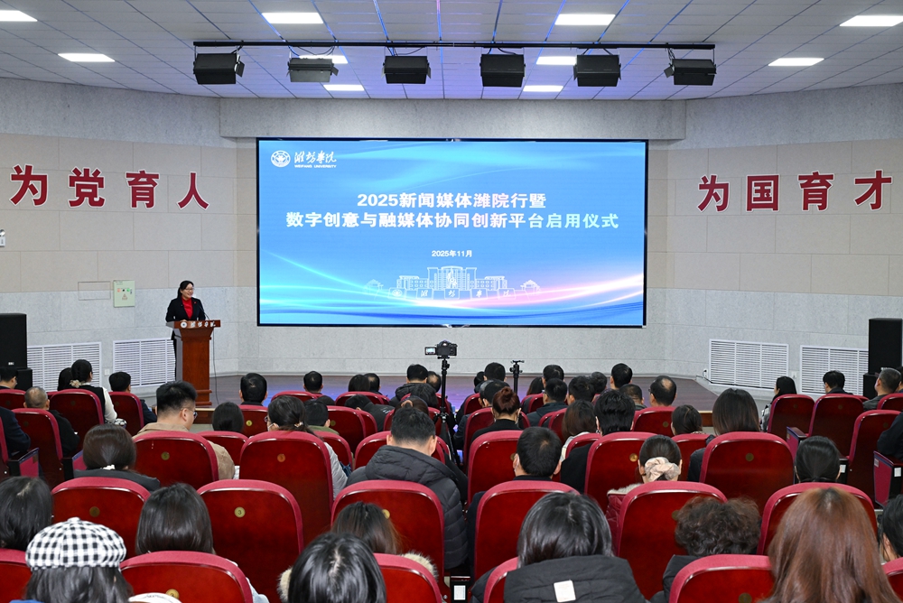 仪式上,来逢波代表学校对各位来宾、媒体记者表示欢迎,并介绍了学校在学科建设、人才培养、师资队伍、科研创新和社会服务等方面取得的成果。他表示,数字创意与融媒体协同创新平台的启用,是学校落实媒体融合发展要求、提升传播能力、强化育人功能的战略举措,将聚焦育人初心、融合创新、实践赋能三大核心使命,构建具有潍院特色的全媒体传播体系,打造校媒合作、产教融合的高水平实践基地。学校将以此为契机,推动宣传工作从“信息传递”向“价值引领”跃升,从“单点发声”向“系统传播”转型,从“内容生产”向“生态构建”迈进,努力让潍院故事传得更远、潍院声音更加响亮、潍院形象更加鲜明。