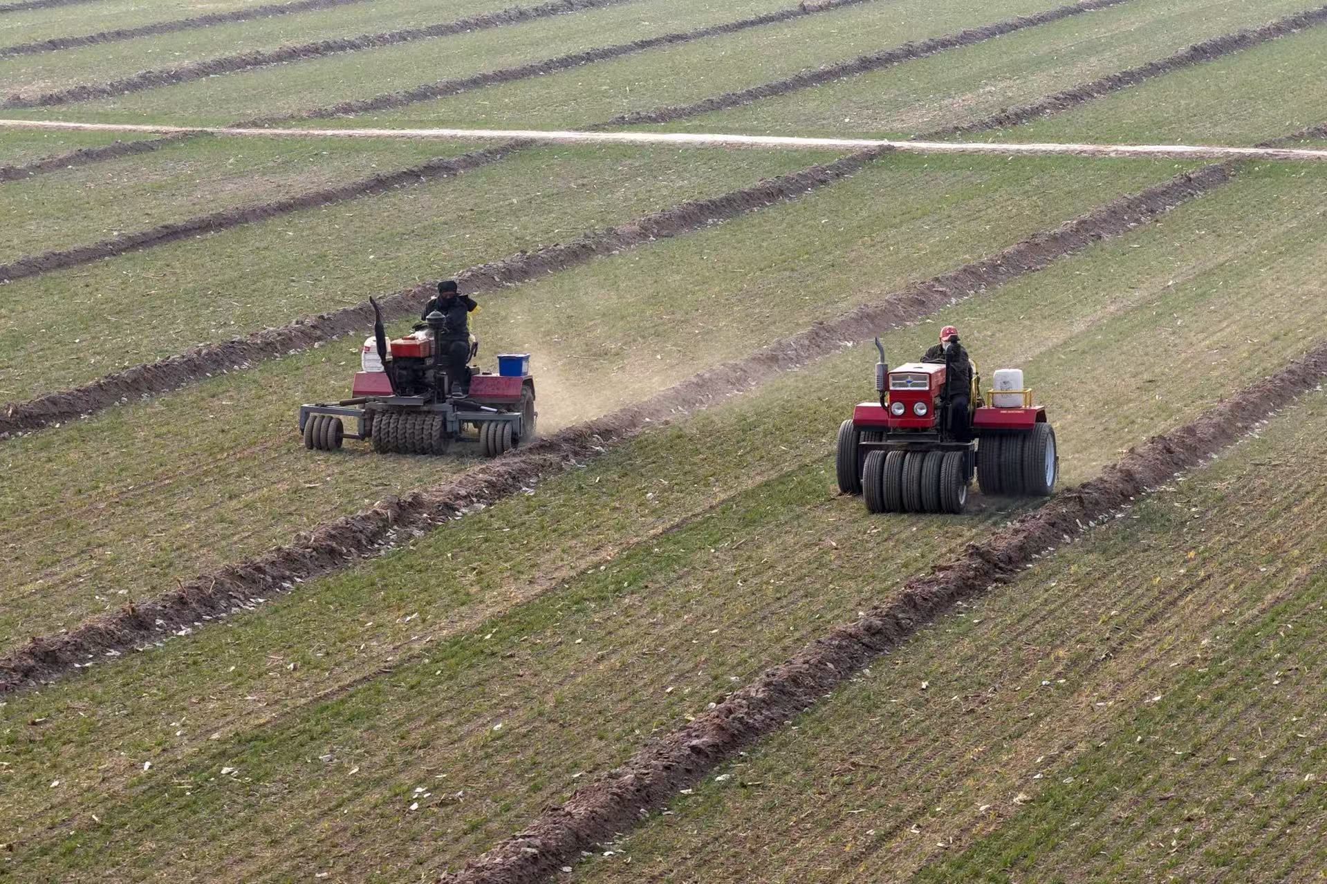 12月11日,在山东省聊城市茌平区杜郎口镇袁庄新村,农机手驾驶农机进行麦田镇压作业,提高小麦保暖防冻能力。马红坤摄