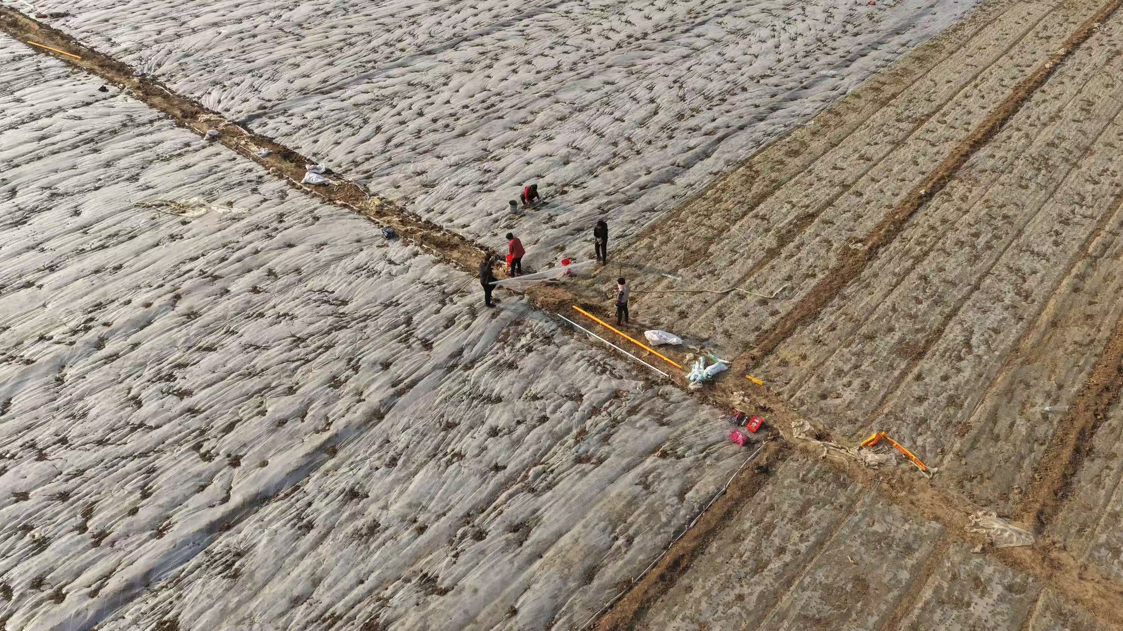 12月10日,在山东省聊城市茌平区贾寨镇苗庄村田间,村民在给种植的大蒜覆盖防寒薄膜。赵玉国摄
